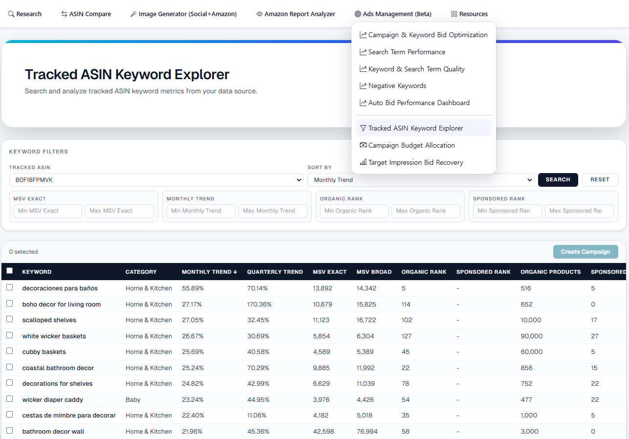 Selecting 'Tracked ASIN' in the Ads Management (Beta) menu will show the two ASINs already registered, and you can choose one of them.