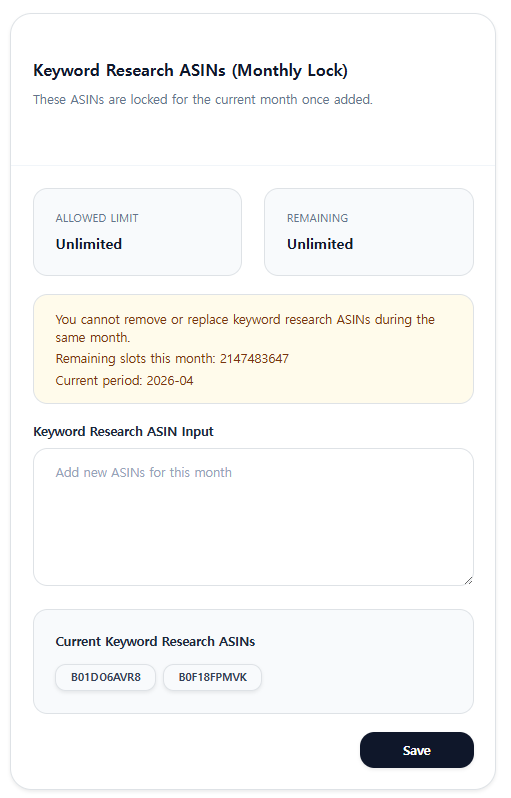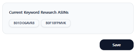 En la página a la que irás verás un espacio llamado Keyword Research ASINs (Monthly Lock). En ese espacio, introduce el ASIN que quieres rastrear en 'Keyword Research ASIN Input' y guárdalo. Una vez guardado, aparecerá listado abajo en Current Keyword Research ASINs.