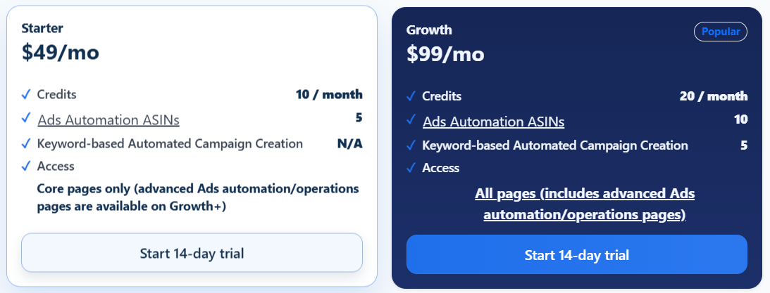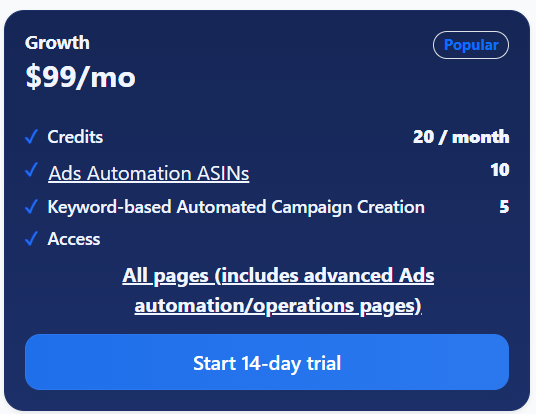 Pero si desea que realmente funcione la automatización —rastreo de palabras clave de productos competidores, generación automática de campañas y registro automático de palabras clave negativas— debe usar al menos el Plan Growth.