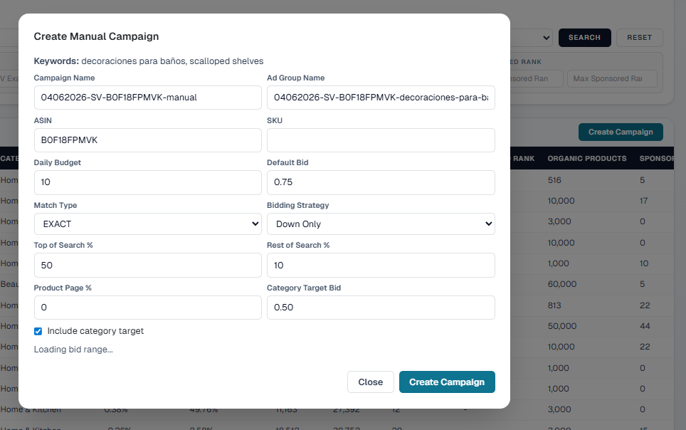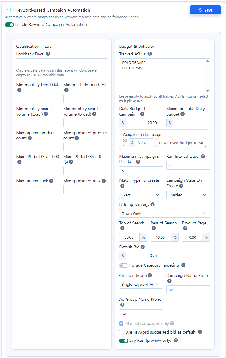 Porque el núcleo de esta función no es simplemente ver los datos, sino que en realidad generación automática de campañas y registro automático de palabras clave negativas funcionando. El flujo central de esta actualización es rastrear las palabras clave de productos competidores para crear automáticamente campañas para las palabras clave que cumplan las condiciones y limpiar automáticamente las búsquedas ineficientes. En la práctica, en SellerVisor se puede explorar palabras clave basadas en ASIN rastreados y crear una campaña directamente con Create Campaign; en Keyword-Based Campaign Automation se pueden guardar los valores de configuración y generar automáticamente; y con Dry Run es posible ver una vista previa. Además, Ads Management está diseñado para manejar la gestión de negativos y el concepto de protected conjuntamente.