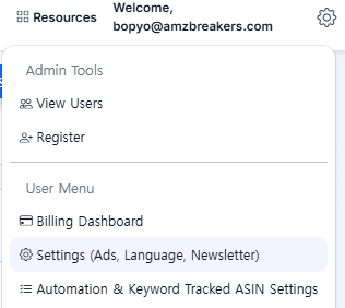 Después de iniciar sesión en SellerVisor, pulsa el engranaje a la derecha y selecciona 'Automation & Keyword Tracking ASIN Settings'.