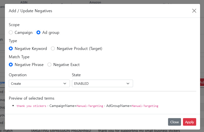 4. Check all on the newly added Negative Keyword Page
