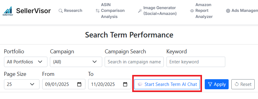 1. If you are a SellerVisor member and have linked the advertising API in the settings menu, please click on Ads Management(Beta) > Search Term Performance in the top menu.