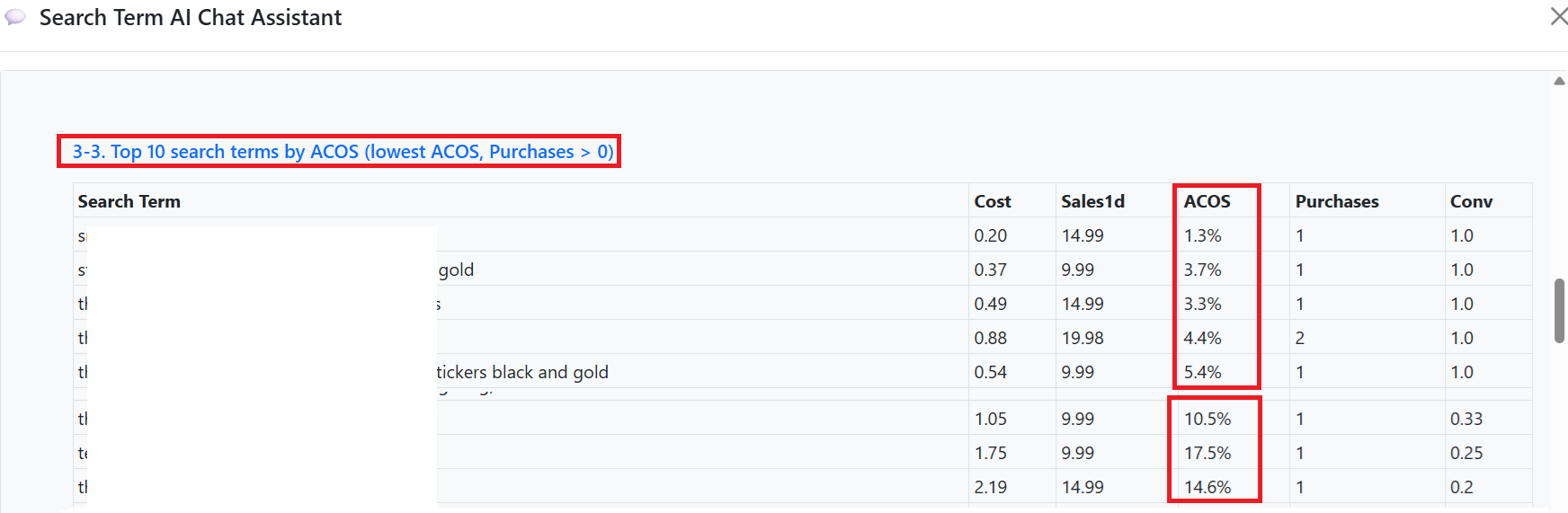 For the top 10 search terms by ACOS (excluding zero sales) that show the most efficient or least efficient keywords, it prioritizes showing 10 keywords with good purchase conversion rates. Refer to the image above. ACOS of 1.3%, 3.7%, 3.3%, 4.4%, 5.4%, etc., can be checked directly. Therefore, you can immediately identify which keywords have good purchase conversion rates.