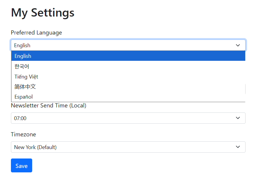5. Updated page title: “Settings” renamed to “Settings (Language, Newsletter)” for clearer context.